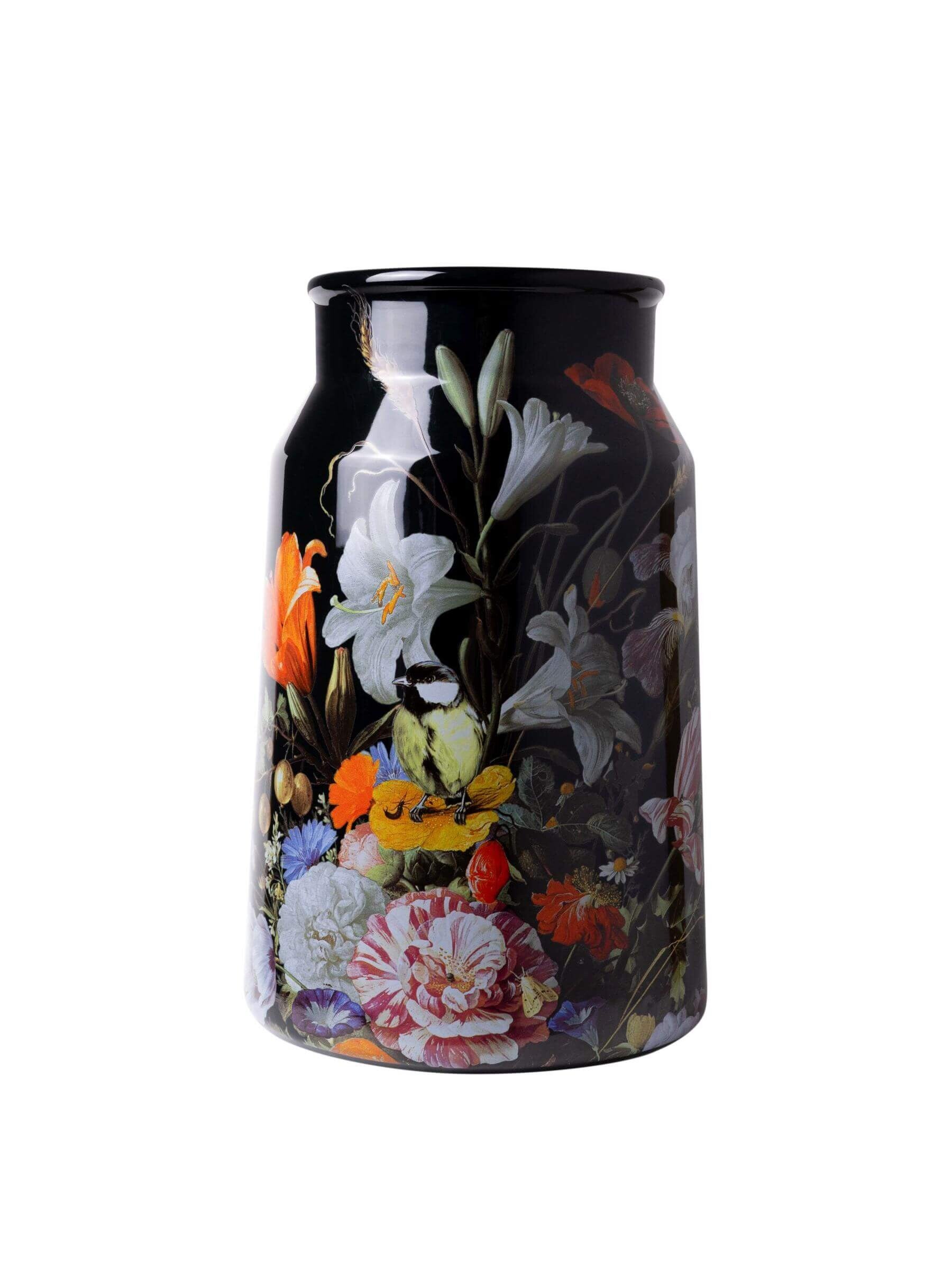 Deze grote vaas heeft de vorm van een iconische oude melkbus. In de eerste helft van de 20e eeuw was het een typerend beeld voor de boeren identiteit van Nederland. Het landschap was bezaaid met kleine boerderijtjes waar dagelijks druk gemolken werd. De zuivelboeren zetten hun ijzeren melkbussen in groepjes langs de kant van de weg, waar ze opgepikt werden door de wagens om ze naar de melkfabriek te brengen. Soms was de melk al zuur voordat deze bij de fabriek was aangekomen en af en toe werd er zelfs een verdronken katje in aangetroffen, die geprobeerd had om van de melk te snoepen. Het idyllische beeld van verweerde stalen melkbussen bij de oprit van het boerenerf verdween in een rap tempo vanaf 1962, toen de gekoelde melktank zijn opmars maakte. Alleen in één plaatsje in Nederland waren de originele melkbussen nog in gebruik tot 1999 tot ook deze melkfabriek geen bussenmelk meer aannam. De vaas in de vorm van een melkbus is rondom gedecoreerd met weelderige bloemen op een zwarte achtergrond, zoals de meesterschilders vroeger een stilleven vol kleurrijke bloemen schilderden. Een bijzondere vaas waarin veel Nederlandse geschiedenis samenkomt.